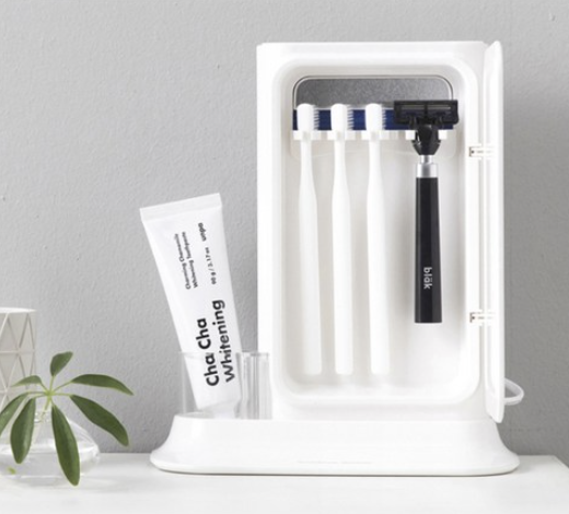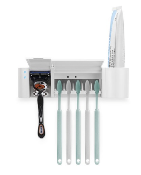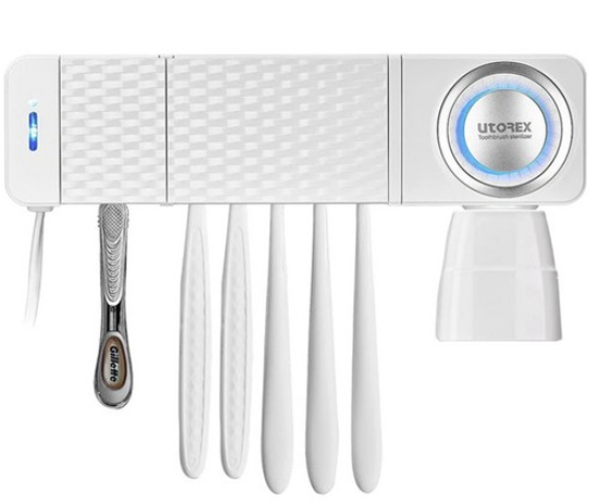 유토렉스 퍼펙트케어 탈취 공기정화 칫솔살균기: 면도기와 큰 사이즈의 칫솔 거치가 가능하며, 양치컵을 거꾸로 자석으로 부착하여 사용할 수 있습니다. 75도의 고온으로 살균 및 건조하며, 살균 세라믹 히팅 발열판을 사용합니다. 치약을 보관할 공간이 없는 점이 아쉽습니다. 무게는 310g, 소비 전력은 7W입니다.
